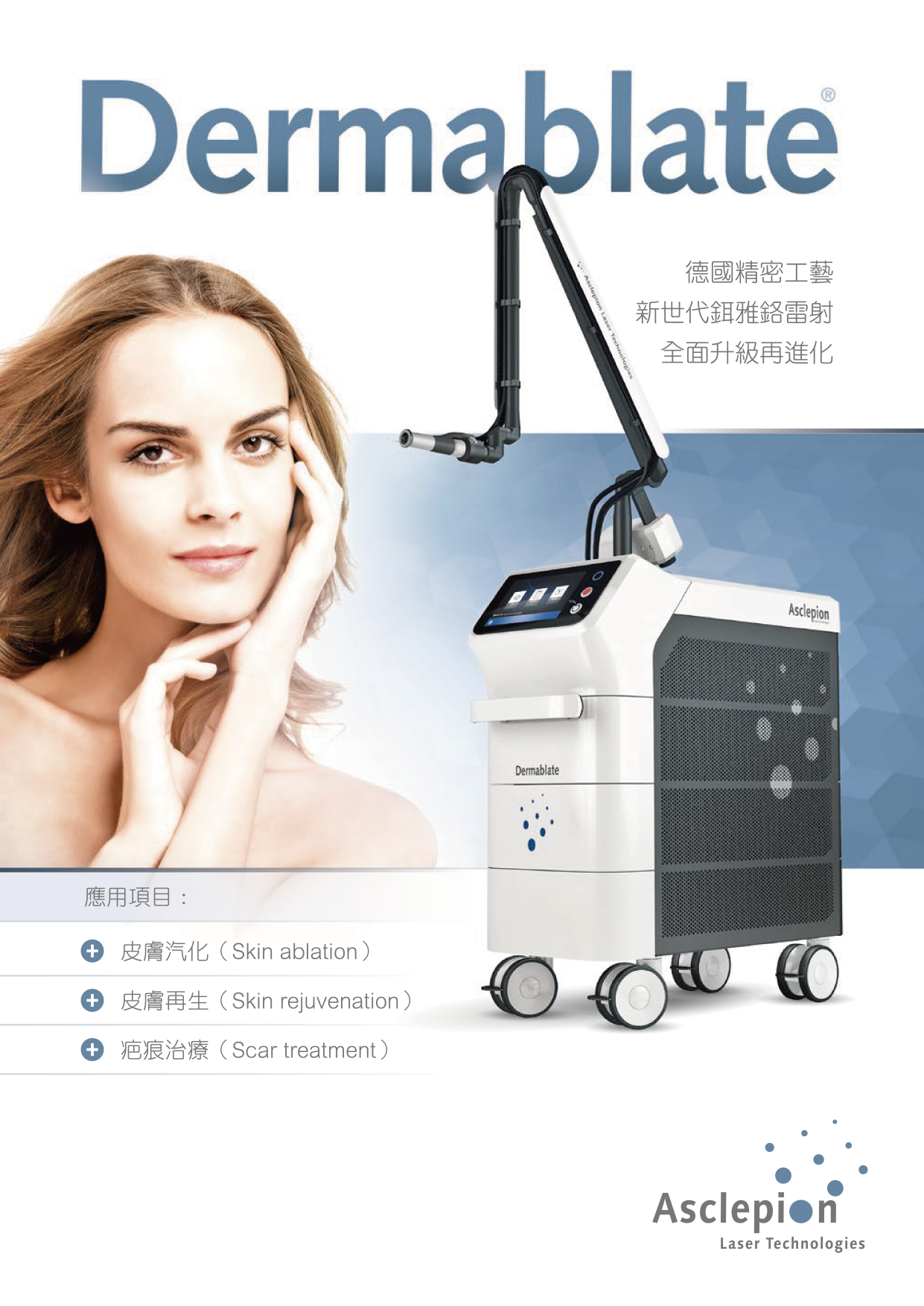 Dermablte使用對水分吸收最高的2940nm波長鉺雅鉻雷射,能夠使用在皮膚科、婦產科進行治療,本產品適用於表淺皮膚的脫落、切除、汽化及凝結。